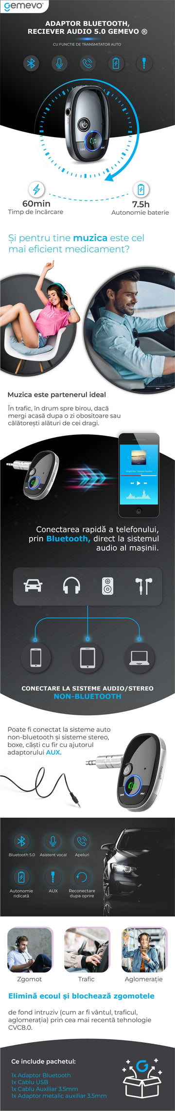 Adaptorul Bluetooth 5.0 Gemevo este soluția ideală pentru a reda muzica preferată sau a prelua apeluri hands-free în orice autoturism. Cu funcție dublă de recepție și transmisie audio, acest dispozitiv transformă instant sistemul audio clasic al mașinii într-unul modern, wireless. Se conectează rapid prin jack 3.5mm și este compatibil cu majoritatea smartphone-urilor, tabletelor și sistemelor audio. Designul compact și culoarea neagră elegantă îl fac discret și ușor de integrat în orice interior auto. Bucură-te de sunet clar, conectivitate stabilă și confort în timpul condusului cu tehnologia Bluetooth 5.0 de la Gemevo.