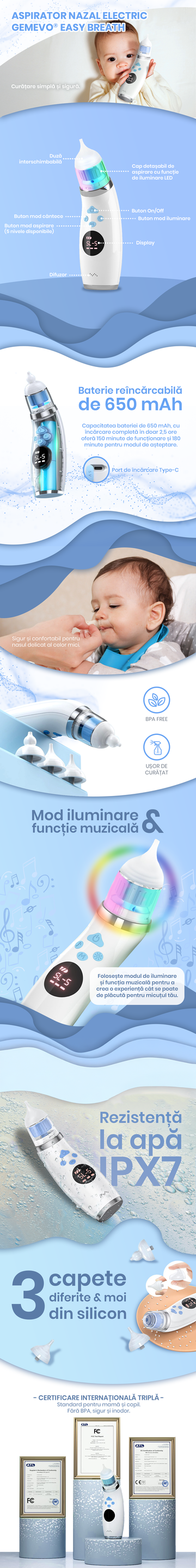 Aspirator Nazal Electric Gemevo® EASY BREATH este conceput special pentru bebeluși și copii, oferind o soluție blândă, eficientă și modernă de curățare a căilor nazale.