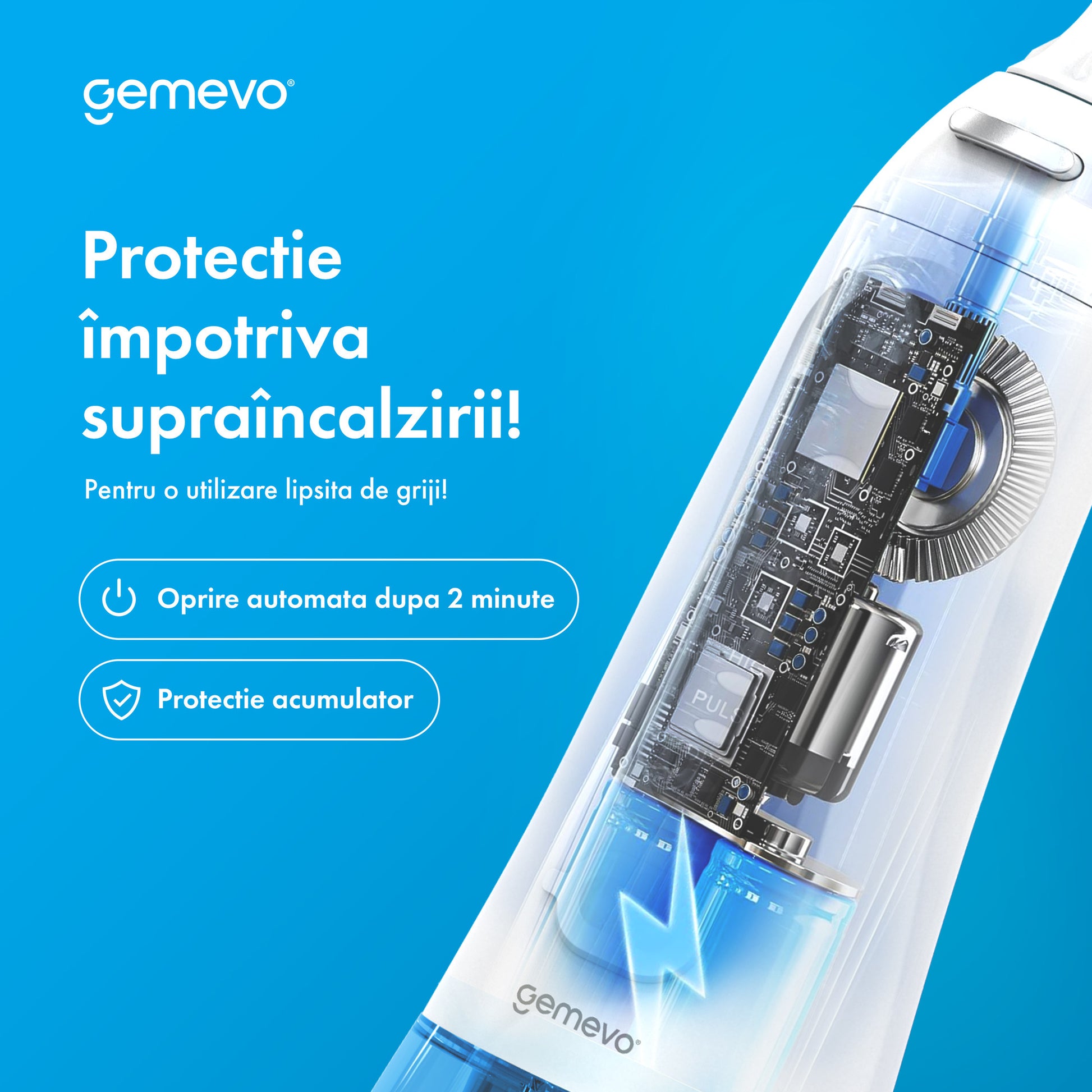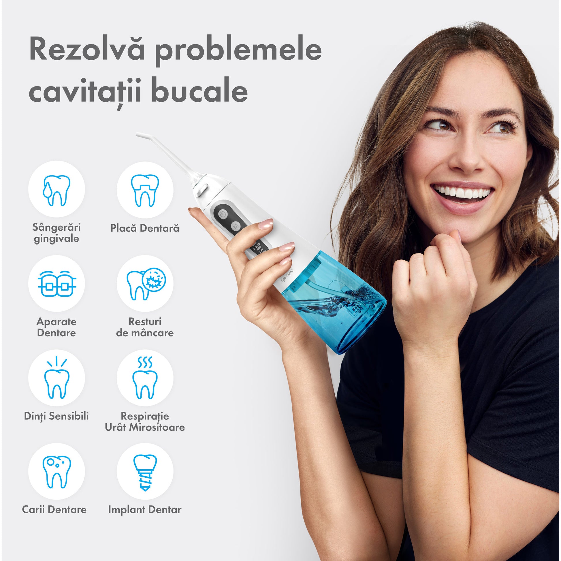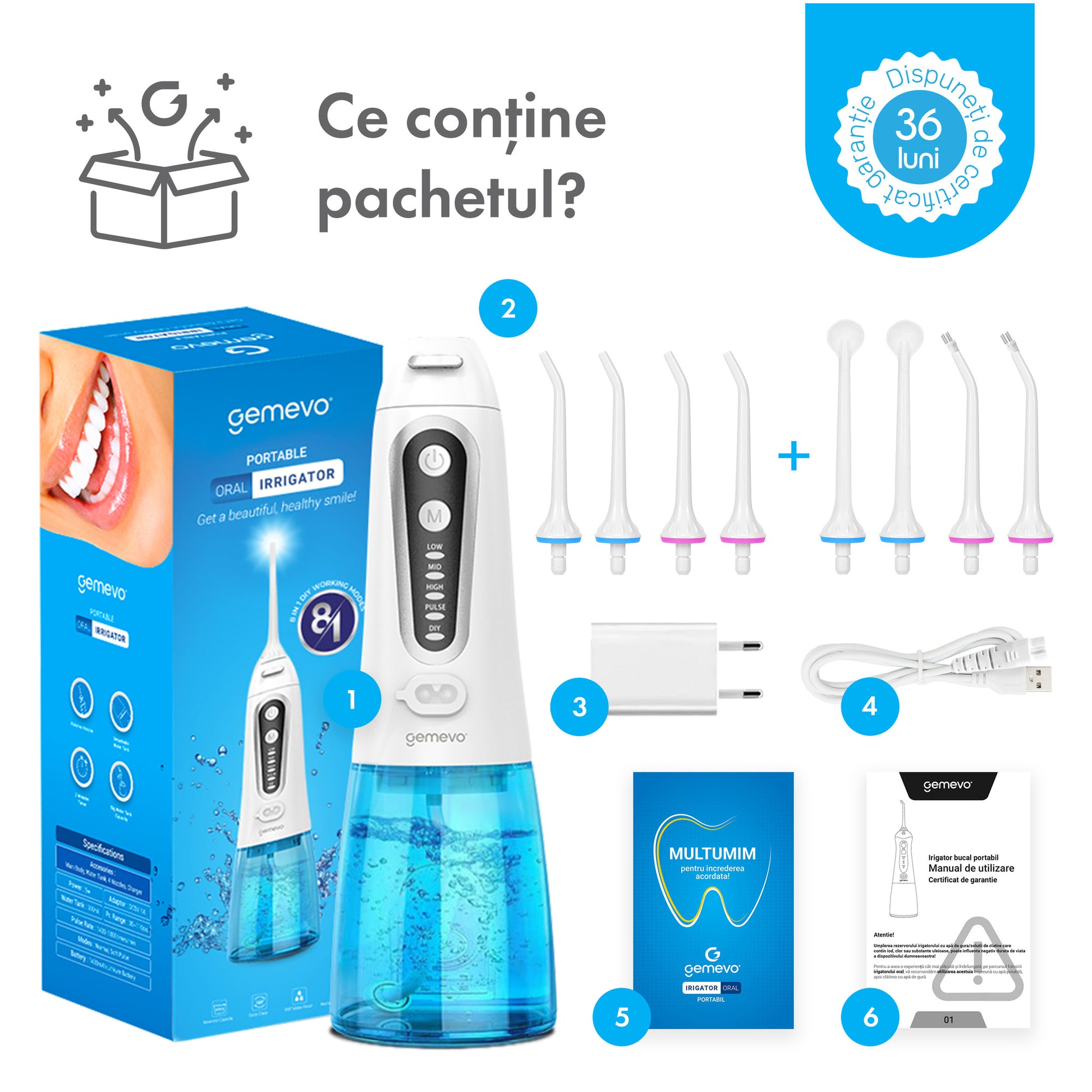 Irigator Gemevo - soluția ideală pentru o igienă impecabilă. Cu ajutorul tehnologiei avansate și a celor 5 trepte de presiune, acest aparat îndepărtează resturile alimentare și placa bacteriană chiar și din cele mai greu accesibile zone.