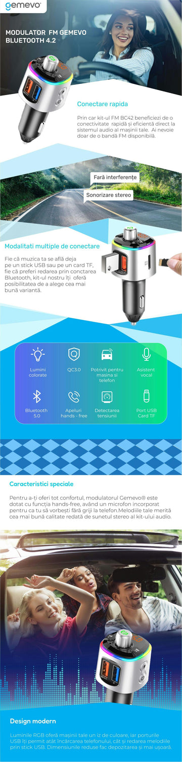 Datorită tehnologiei avansate, acest transmitator bluetooth auto asigură o calitate audio clară, eliminând interferențele și făcând ca fiecare drum să fie mai plăcut. Bucură-te de o experiență audio impecabilă cu un modulator FM bluetooth Gemevo!